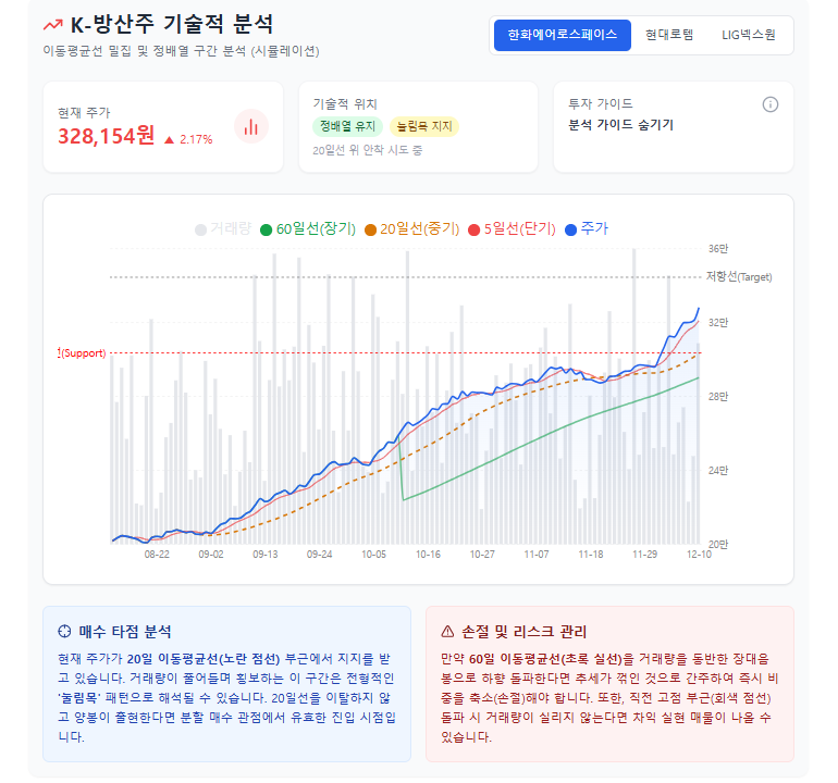 전체적인 방산 섹터의 일봉 차트를 종합해보면, 긴 상승 추세 속에서 건전한 '기간 조정' 혹은 '눌림목' 구간을 형성하고 있는 모습이 자주 포착됩니다. 급등에 따른 피로감을 해소하며 다음 상승을 위한 에너지를 비축하는 과정으로 해석됩니다.