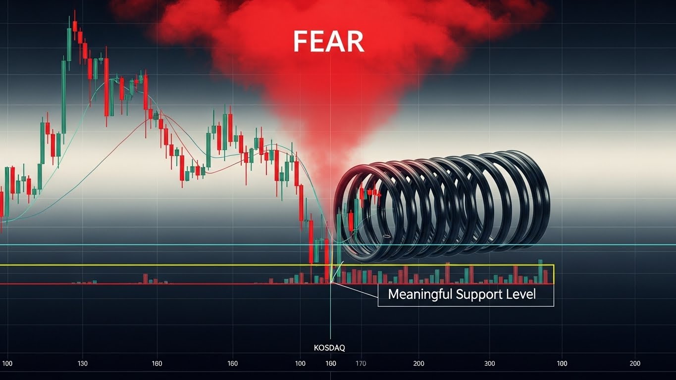 차트를 보면 현재 코스닥 시장은 '용수철이 압축된 상태'와 유사합니다. 단기 급락으로 인해 공포 심리가 극에 달했지만, 기술적으로는 의미 있는 지지선에 도달했습니다.