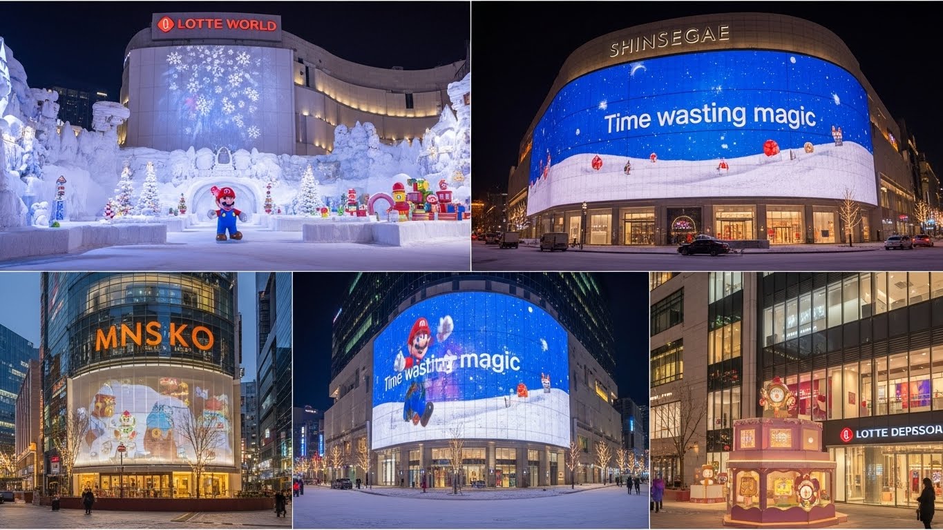 마지막은 역시 명동입니다. 신세계백화점 본점의 미디어 파사드는 이제 서울의 겨울을 상징하는 대명사가 되었죠. '시간을 끄는 마법'이라는 주제로 펼쳐지는 압도적인 영상미는 정말 영화 한 편을 보는 기분이에요. 맞은편 롯데백화점의 아기자기한 오르골 전시와 활기 넘치는 명동 거리 축제까지 즐기면 완벽한 하루가 완성된답니다! 😊
