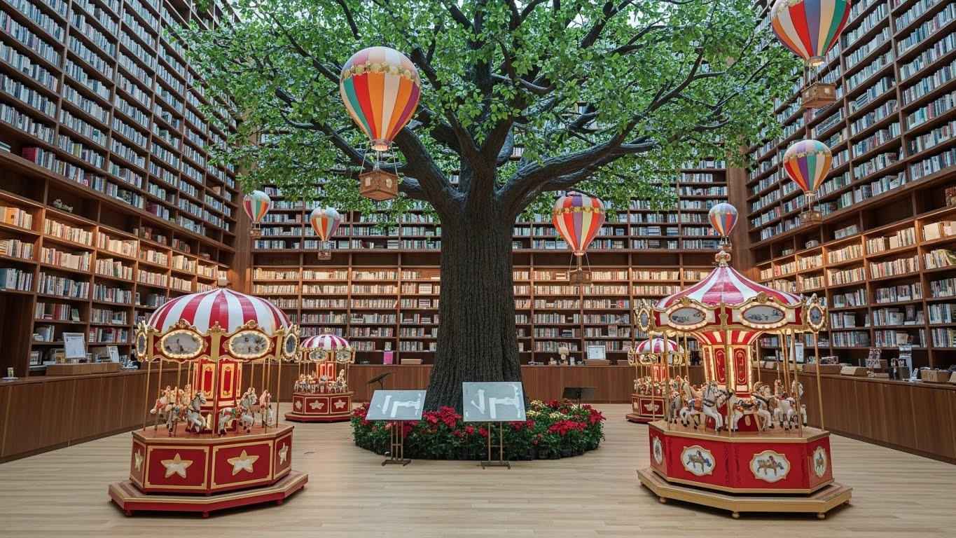 추위를 많이 타시는 분들이라면 강남권 실내 코스를 추천해요. 코엑스 별마당 도서관은 이미 너무 유명하죠? 15m 높이의 거대한 서가 중앙에 세워진 초대형 트리는 그야말로 장관입니다. 올해는 오르골 회전목마와 열기구 장식이 더해져서 마치 동화 속 서재에 들어온 듯한 기분을 느낄 수 있어요.