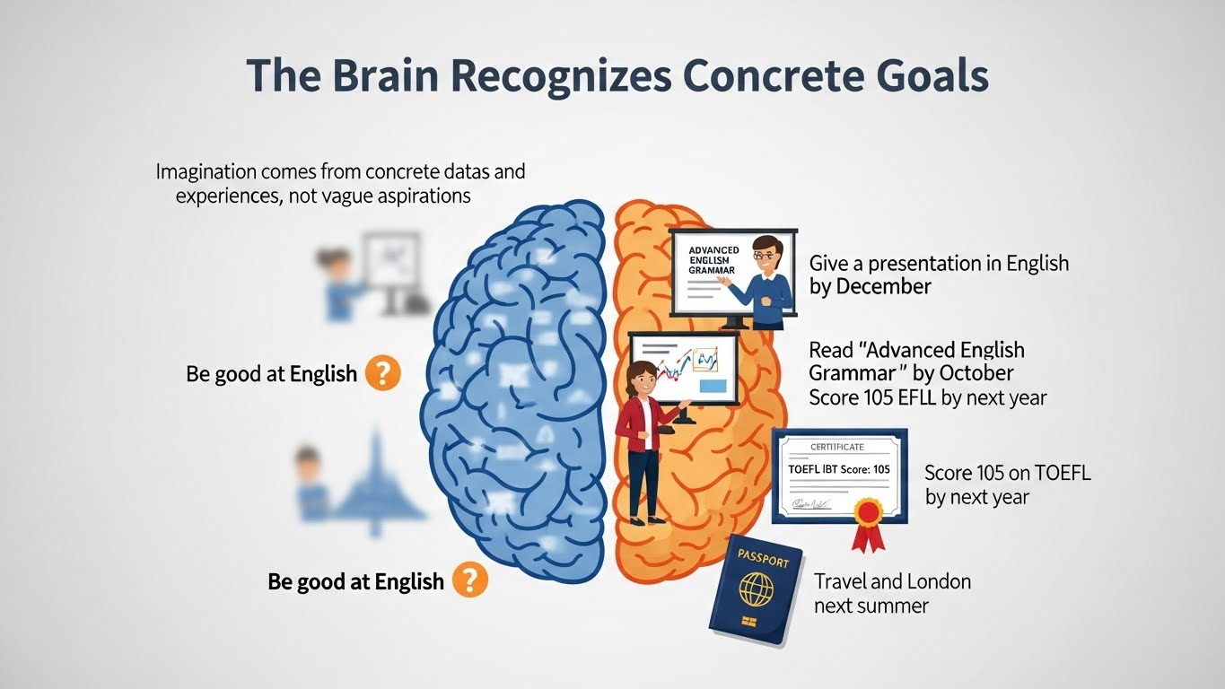"영어를 잘하고 싶다"는 목표는 퓨처 셀프를 만나기에 너무 막연합니다.  뇌는 막연한 목표를 인지하지 못합니다. 상상력은 구체적인 데이터와 경험에서 나옵니다.